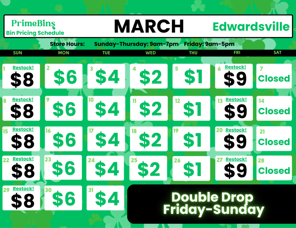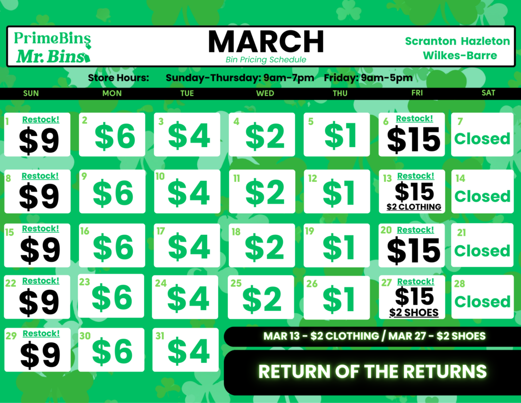 Our bin item price changes daily. $9 means it's restock day! Which day is your favorite? Score great deals no matter the day and be on the lookout for special pricing!